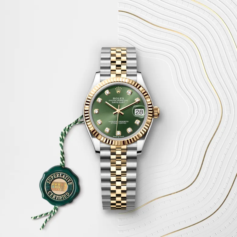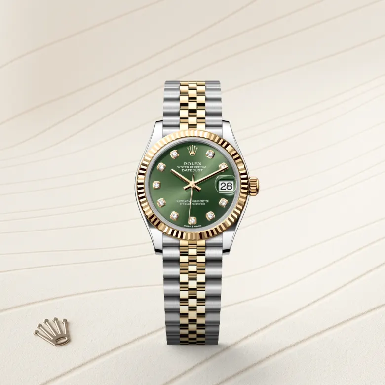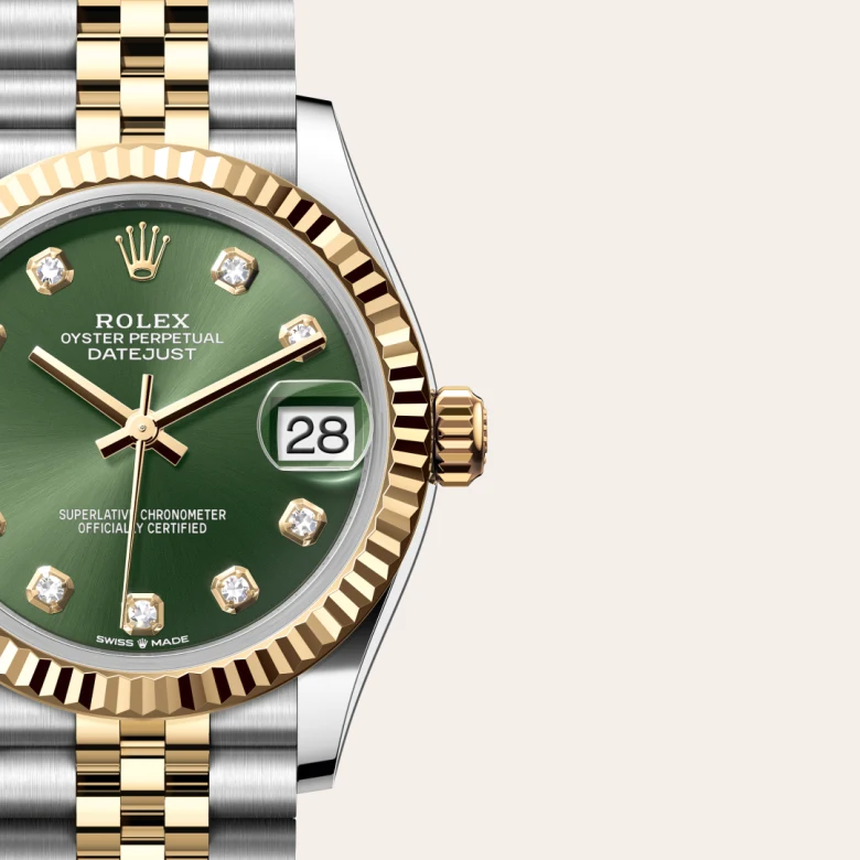 This dial features diamonds in 18 ct gold settings. The sunray finish creates delicate light reflections on many dials in the Oyster Perpetual collection. It is obtained using masterful brushing techniques that create grooves running outwards from the centre of the dial. Light is diffused consistently along each engraving, creating a characteristic subtle glow that moves depending on the position of the wrist. Once the sunray finish has been completed, the dial colour is applied using Physical Vapour Deposition or electroplating. A light coat of varnish gives the dial its final look.