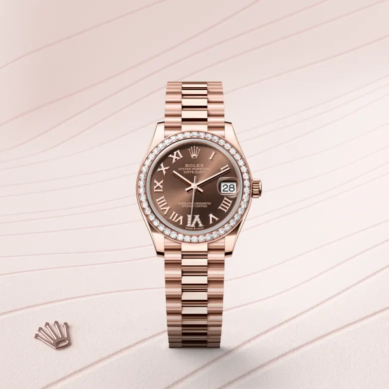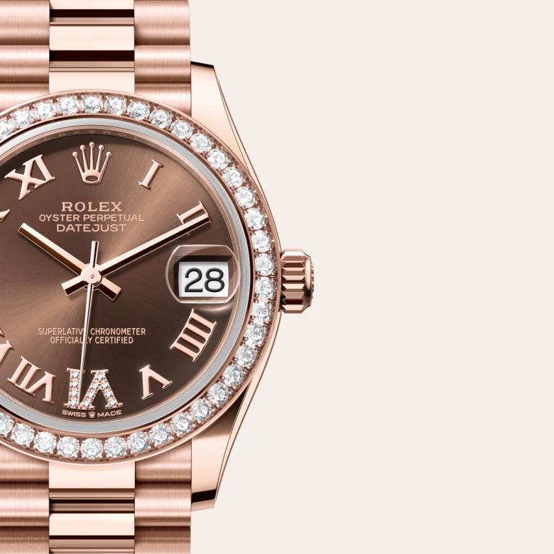 This dial features a large VI set with 11 diamonds. The sunray finish creates delicate light reflections on many dials in the Oyster Perpetual collection. It is obtained using masterful brushing techniques that create grooves running outwards from the centre of the dial. Light is diffused consistently along each engraving, creating a characteristic subtle glow that moves depending on the position of the wrist. Once the sunray finish has been completed, the dial colour is applied using Physical Vapour Deposition or electroplating. A light coat of varnish gives the dial its final look.