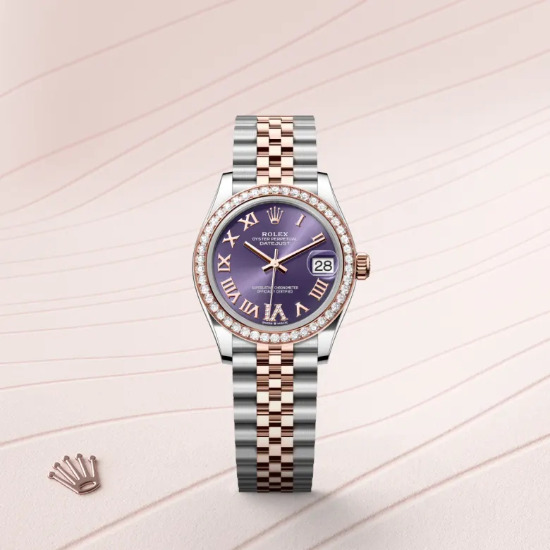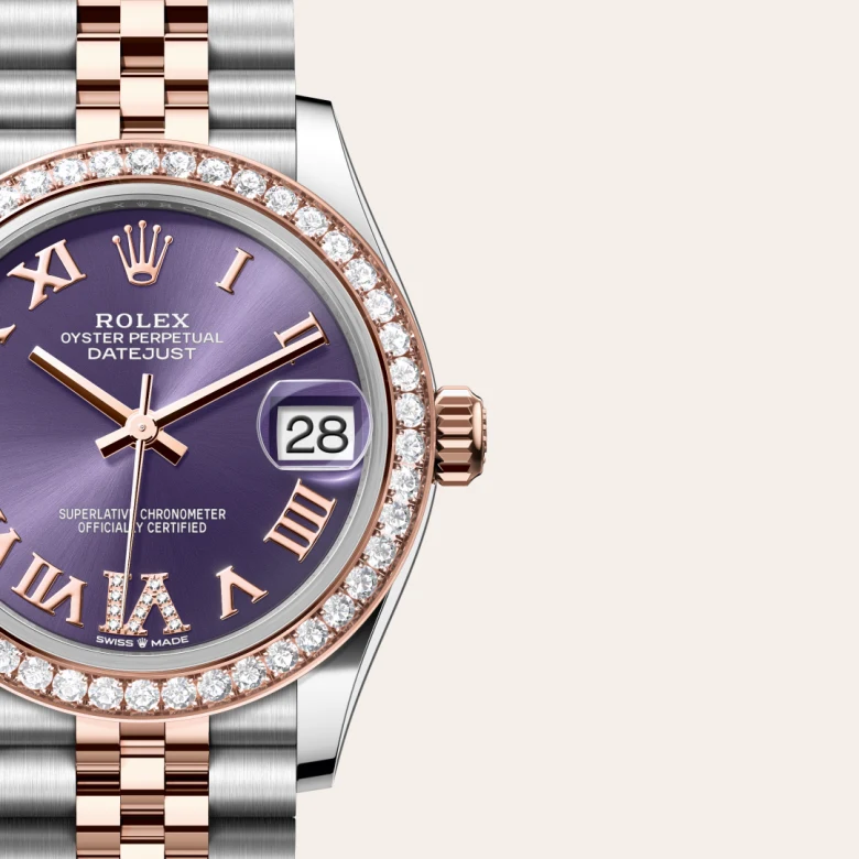 This dial features a large VI set with 11 diamonds. The sunray finish creates delicate light reflections on many dials in the Oyster Perpetual collection. It is obtained using masterful brushing techniques that create grooves running outwards from the centre of the dial. Light is diffused consistently along each engraving, creating a characteristic subtle glow that moves depending on the position of the wrist. Once the sunray finish has been completed, the dial colour is applied using Physical Vapour Deposition or electroplating. A light coat of varnish gives the dial its final look.