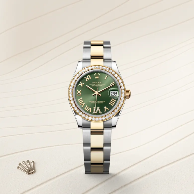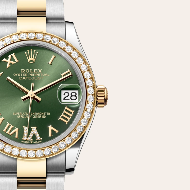 This dial features a large VI set with 11 diamonds. The sunray finish creates delicate light reflections on many dials in the Oyster Perpetual collection. It is obtained using masterful brushing techniques that create grooves running outwards from the centre of the dial. Light is diffused consistently along each engraving, creating a characteristic subtle glow that moves depending on the position of the wrist. Once the sunray finish has been completed, the dial colour is applied using Physical Vapour Deposition or electroplating. A light coat of varnish gives the dial its final look.