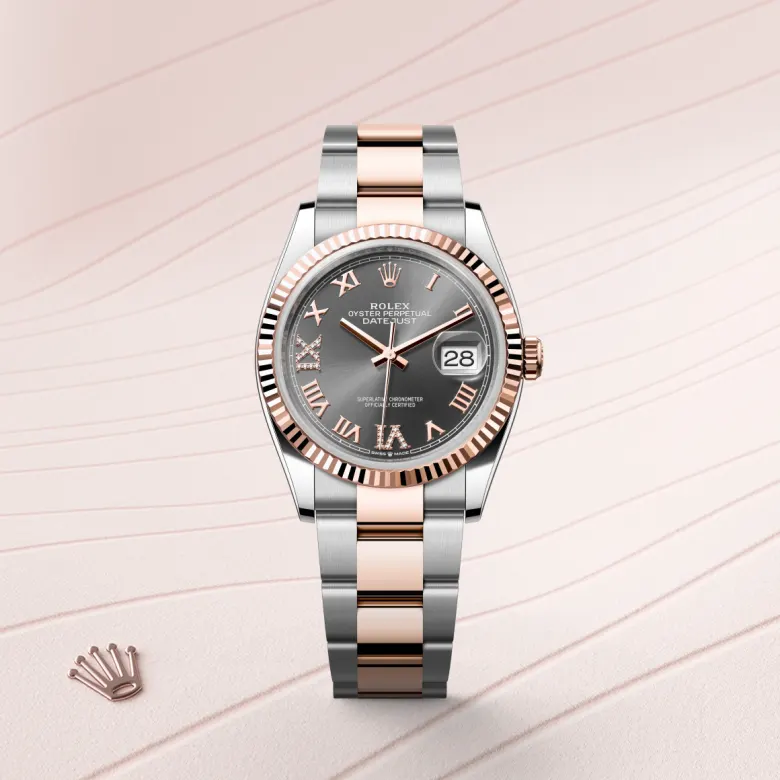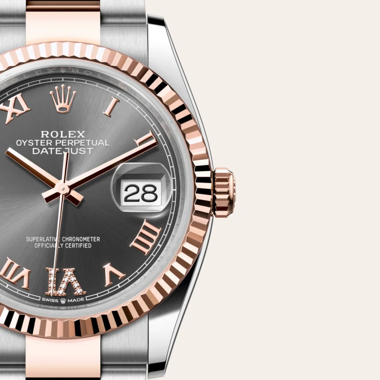 This dial features a Roman VI and IX in 18 ct gold, set with 24 diamonds. The sunray finish creates delicate light reflections on many dials in the Oyster Perpetual collection. It is obtained using masterful brushing techniques that create grooves running outwards from the centre of the dial. Light is diffused consistently along each engraving, creating a characteristic subtle glow that moves depending on the position of the wrist. Once the sunray finish has been completed, the dial colour is applied using Physical Vapour Deposition or electroplating. A light coat of varnish gives the dial its final look.