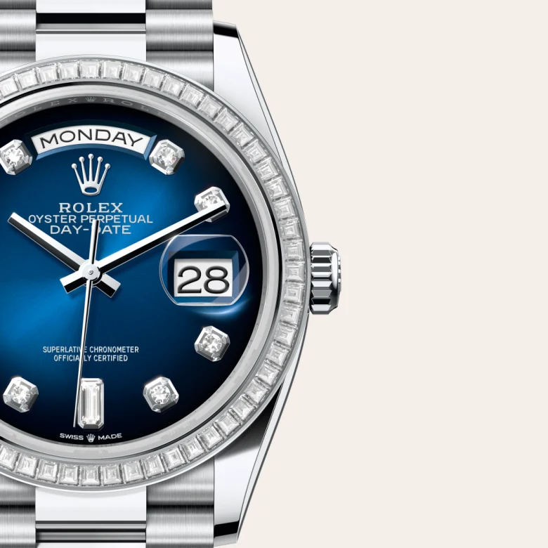 The ombré dial features a coloured surface at the centre, progresses to a deep black around the edge. This dial represents the continuity of a design that Rolex introduced in the 1980s and relaunched in 2019. The manufacture of these dials with a concentric gradient involves the application of black lacquer, a delicate operation overseen by a specialist whose task it is to ensure the harmonious transition from colour to darkness.