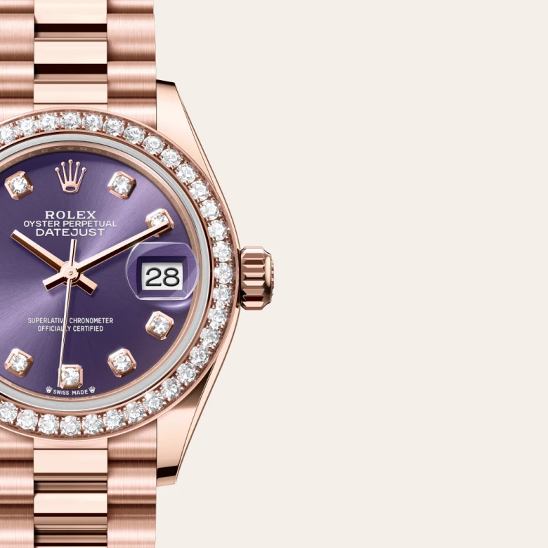 This dial features diamonds in 18 ct gold settings. The sunray finish creates delicate light reflections on many dials in the Oyster Perpetual collection. It is obtained using masterful brushing techniques that create grooves running outwards from the centre of the dial. Light is diffused consistently along each engraving, creating a characteristic subtle glow that moves depending on the position of the wrist. Once the sunray finish has been completed, the dial colour is applied using Physical Vapour Deposition or electroplating. A light coat of varnish gives the dial its final look.